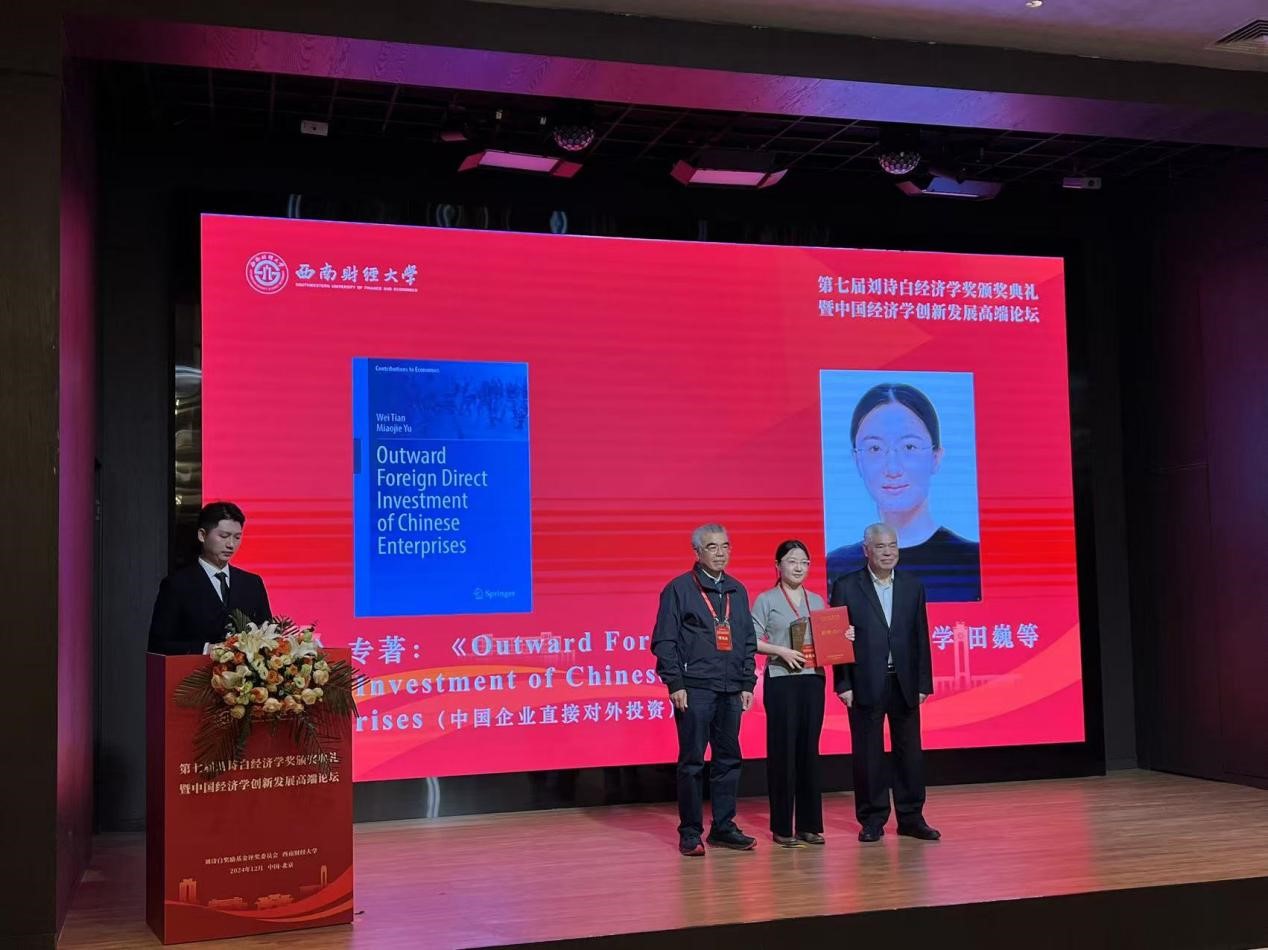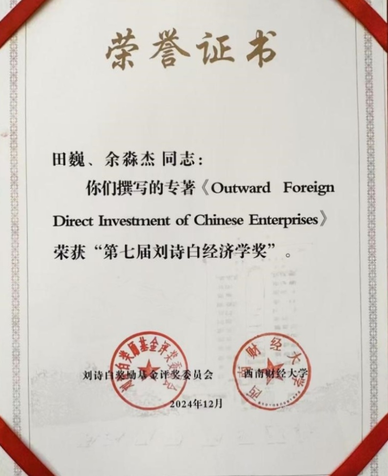 2024年12月22日,第七届刘诗白经济学奖颁奖典礼暨中国经济学创新发展高端论坛在京举行。经资格审核、专家通讯评审和会议评审以及评奖委员会审定,本届共评选出10项获奖成果,北京大学长聘副教授田巍与国产一区二区日本在线校长余淼杰教授合作专著《Outward Foreign Direct Investment of Chinese Enterprises(中国企业对外直接投资)》上榜。这是余淼杰教授继2014年其著作《加工贸易与企业生产率》入选第二届刘诗白经济学奖后再度喜获此奖。